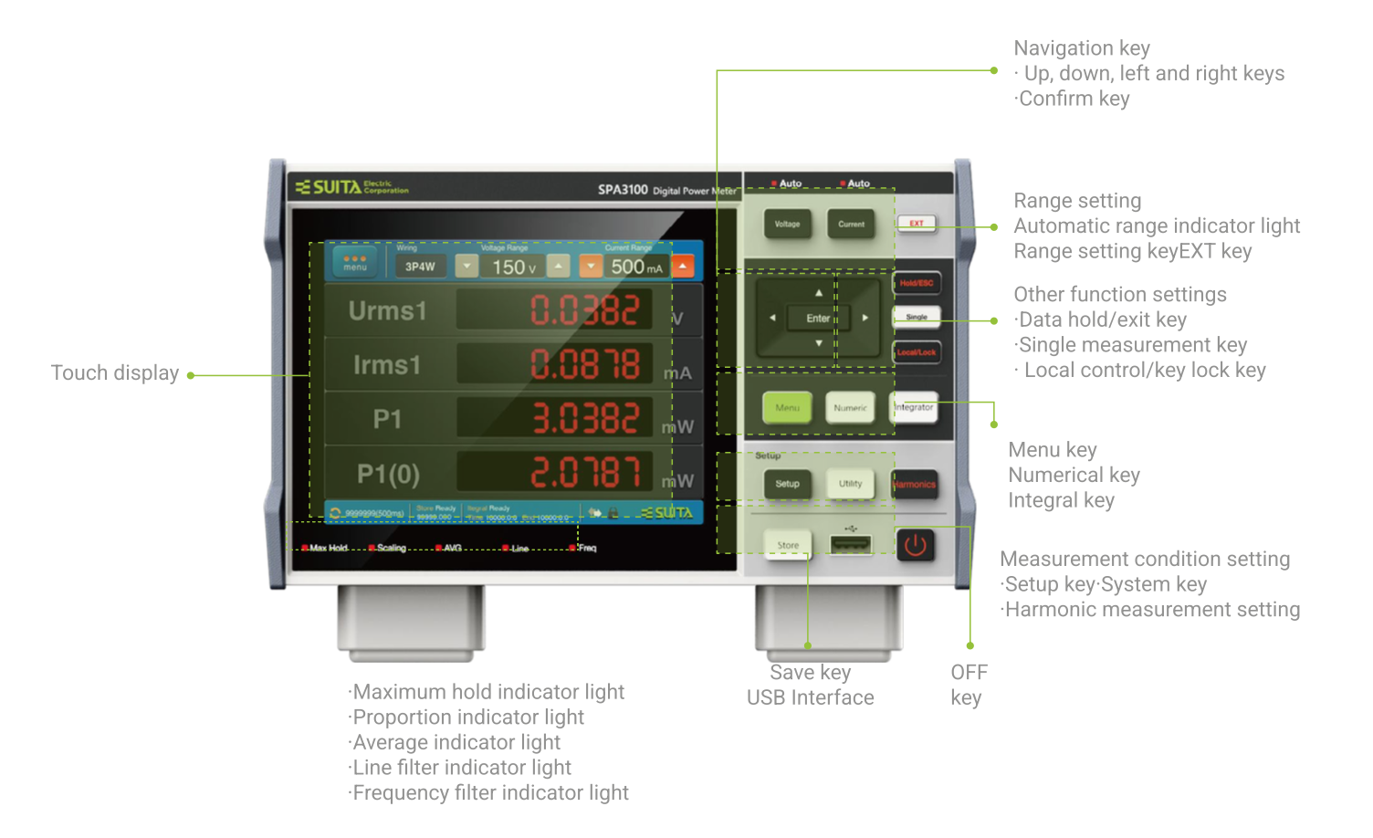 - 峰值保持功能:持續顯示與觀察測量過程中相關數值的最大值。此外,儀器還能夠保持顯示以下測量功能的最大值:電壓與電流的RMS/MEAN/DC/PEAK值、功率峰值、有功功率、無功功率和視在功率。